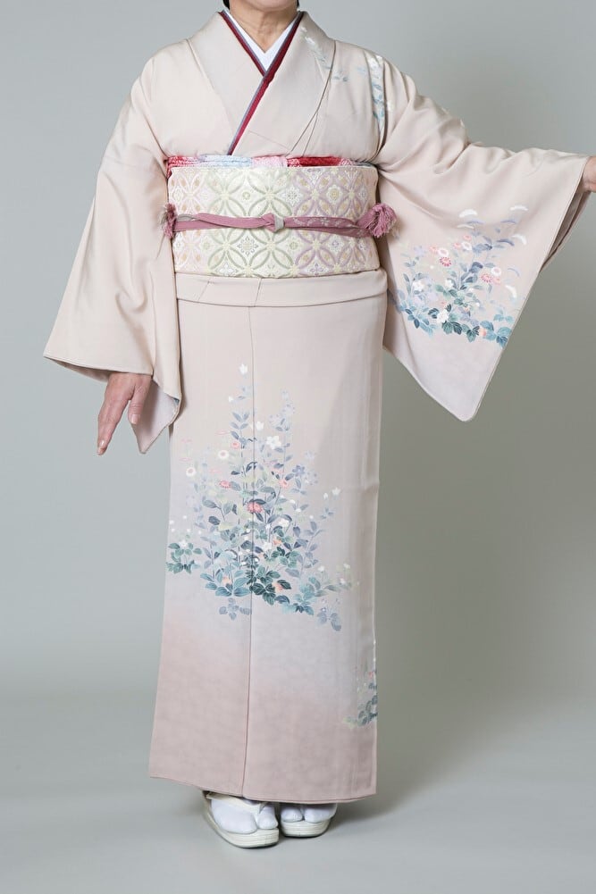 ベージュ地に咲く手描き友禅の花々